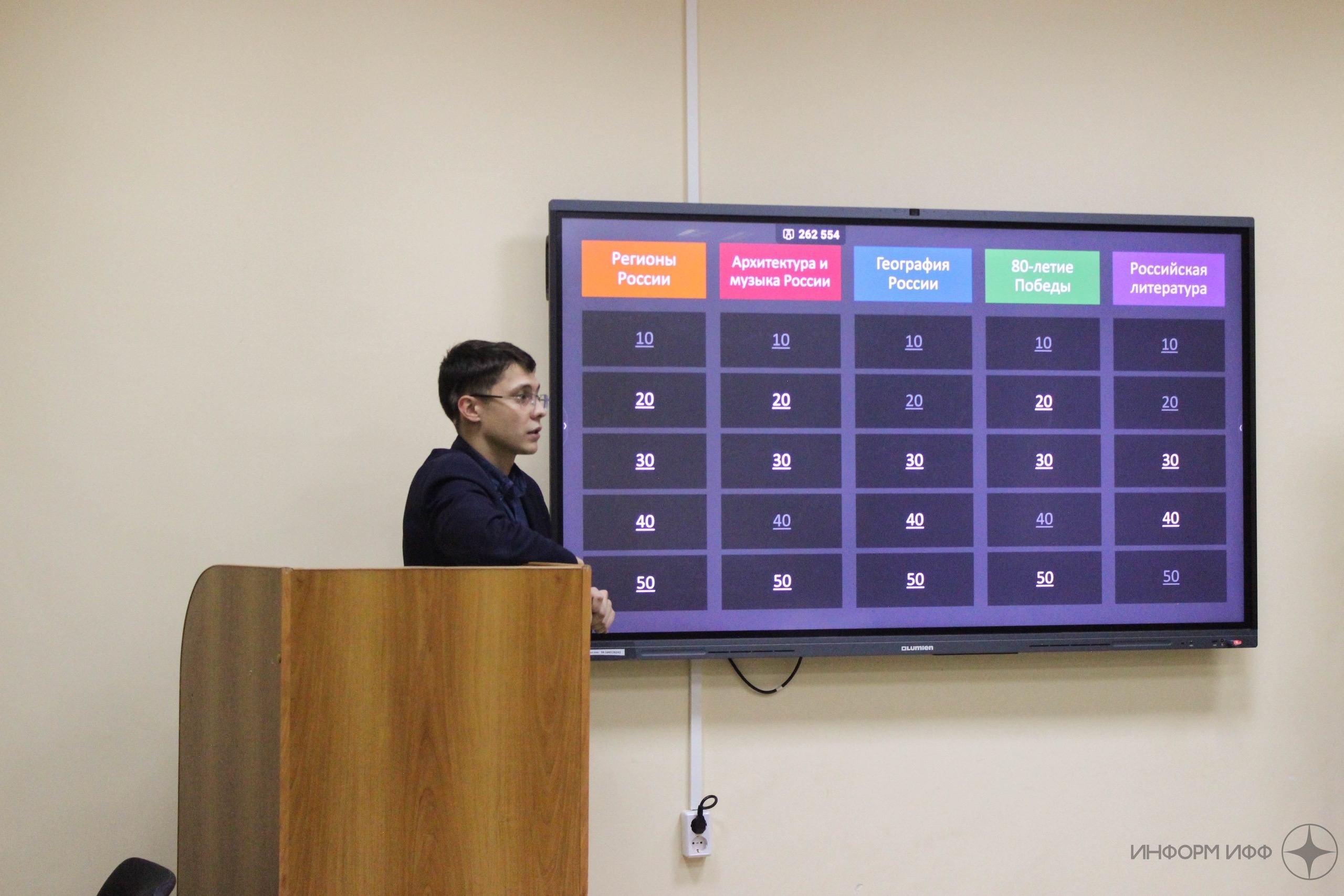 Очный тур проходил в формате телеигры-викторины "Своя игра". Организаторы игры подобрали интересные и познавательные вопросы, охватывающие самые разные сферы: от литературы и географии до изобразительного искусства и современных достижений нашей страны.